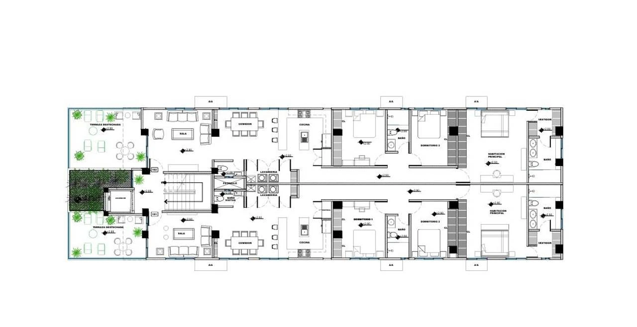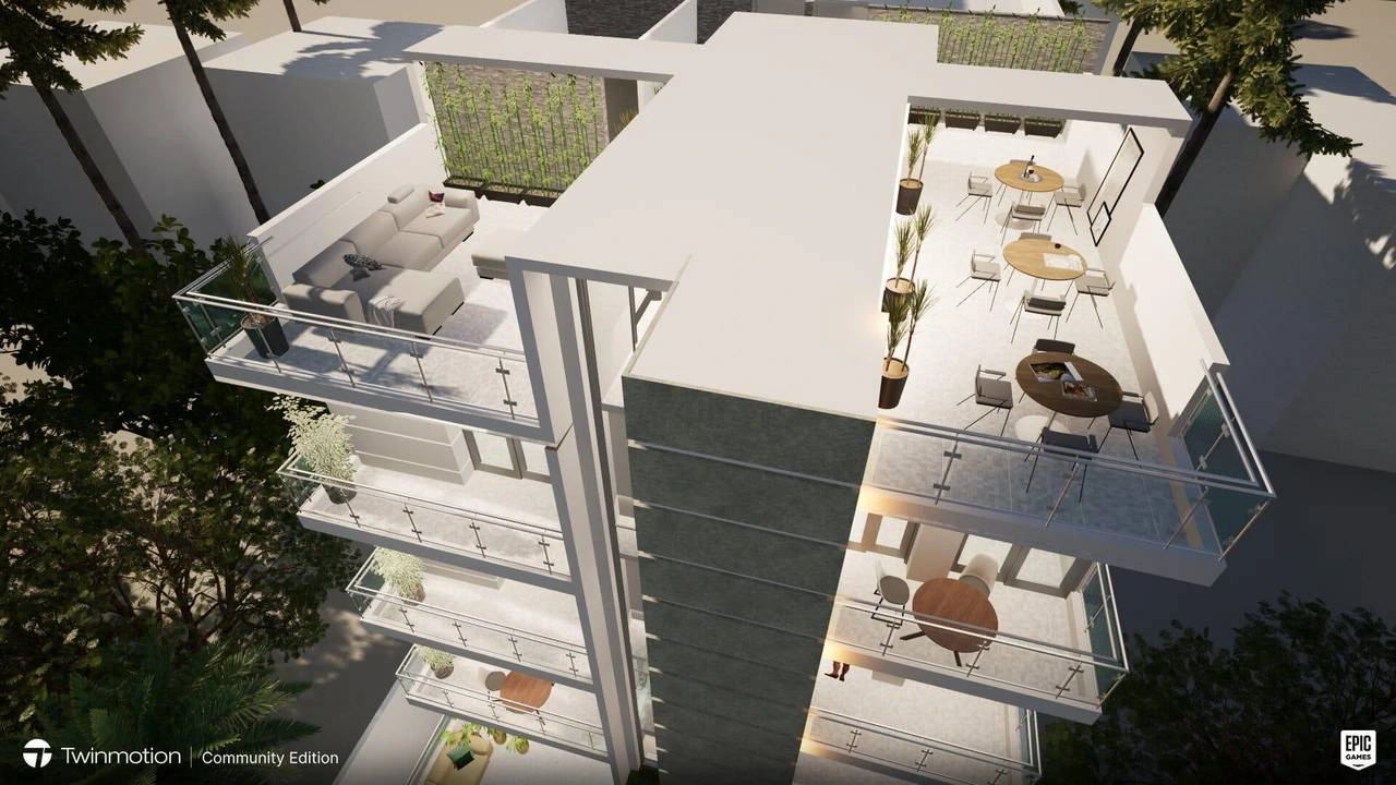 La joya de la corona: Una terraza amueblada en el último nivel. Porque seamos honestos, todos necesitamos un sitio para tomarnos un café o una cerveza viendo la ciudad sin tener que salir del edificio.